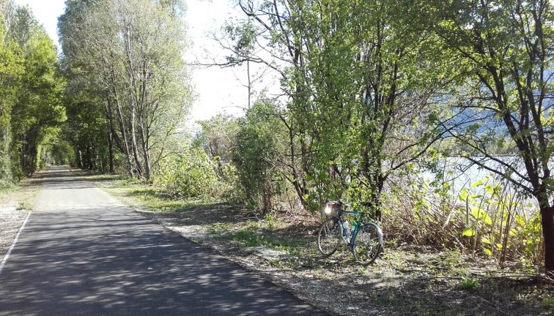 Aujourd'hui je vais franchir 2 nouveaux cols inédits, à partir de Voreppe. Pour m'y rendre il faut que je traverse Grenoble. Je vais suivre la voie verte sur les berges de l'Isère. Il n'y aura donc aucune difficulté liée au profil. Par contre l'usage du GPS est indispensable pour un non-Grenoblois. La piste cyclable emprunte souvent des trottoirs et il s'en suit un gymkhana pas agréable. Une fois sortie de l'agglomération la piste est beaucoup plus agréable. Toujours plate, large et bien revêtue :
