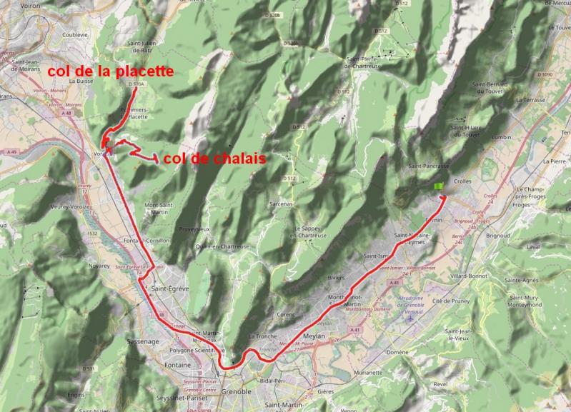 J'arrive rapidement au pont-barrage de Saint Egrève. Là des travaux routiers vont m'empêcher de suivre la trace prévue. Je me débrouille dans la circulation automobile puis retrouve ma route un peu plus loin. Voreppe sera le lieu de départ des deux montées. D'abord vers le col de la placette (587 m.) , puis vers le col de Chalais (930 m.), avec retour à Voreppe entre les deux grimpées :