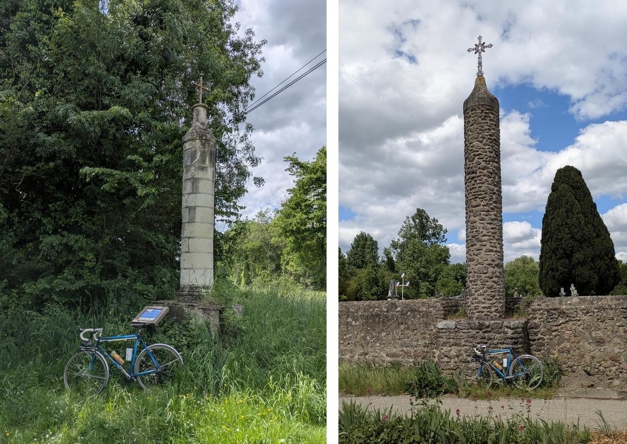 Lundi 5 mai 2025 : découverte de deux colonnes à Cheffes-sur-Sarthe : à gauche la colonne de la croix Mahé et à droite la colonne de la croix blanche :Après seulement quelques belles journées ensoleillées, l'été est déja parti et l'automne semble arriver ! Tant pis nous aurons de la lecture pour d'agréables moments au coin de la cheminée puisque le " Miroir du cyclisme " revient ! ! !
