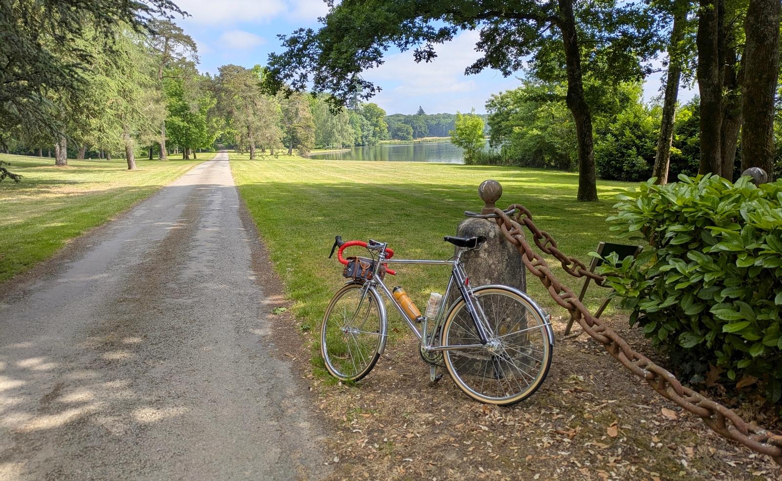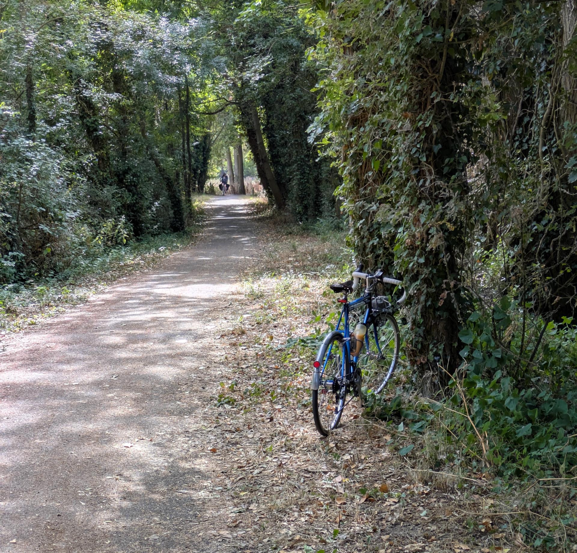 Mardi 29 juillet 2025 : longue allée, à l'ombre, près du Louroux Béconnais :J'aime prendre des photos au cours de mes randonnées. Mais le plus difficile c'est peut-être de profiter des quelques instants, très courts, pendant lesquels le vélo est stable, pour immortaliser un paysage, et revenir rapidement soutenir le vélo juste avant qu'il perde l'équilibre parfait que je lui ai donné ! ! (à éviter bien sûr les jours de grand vent) :