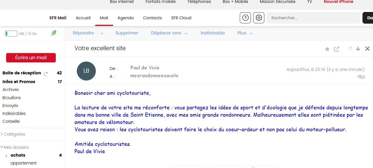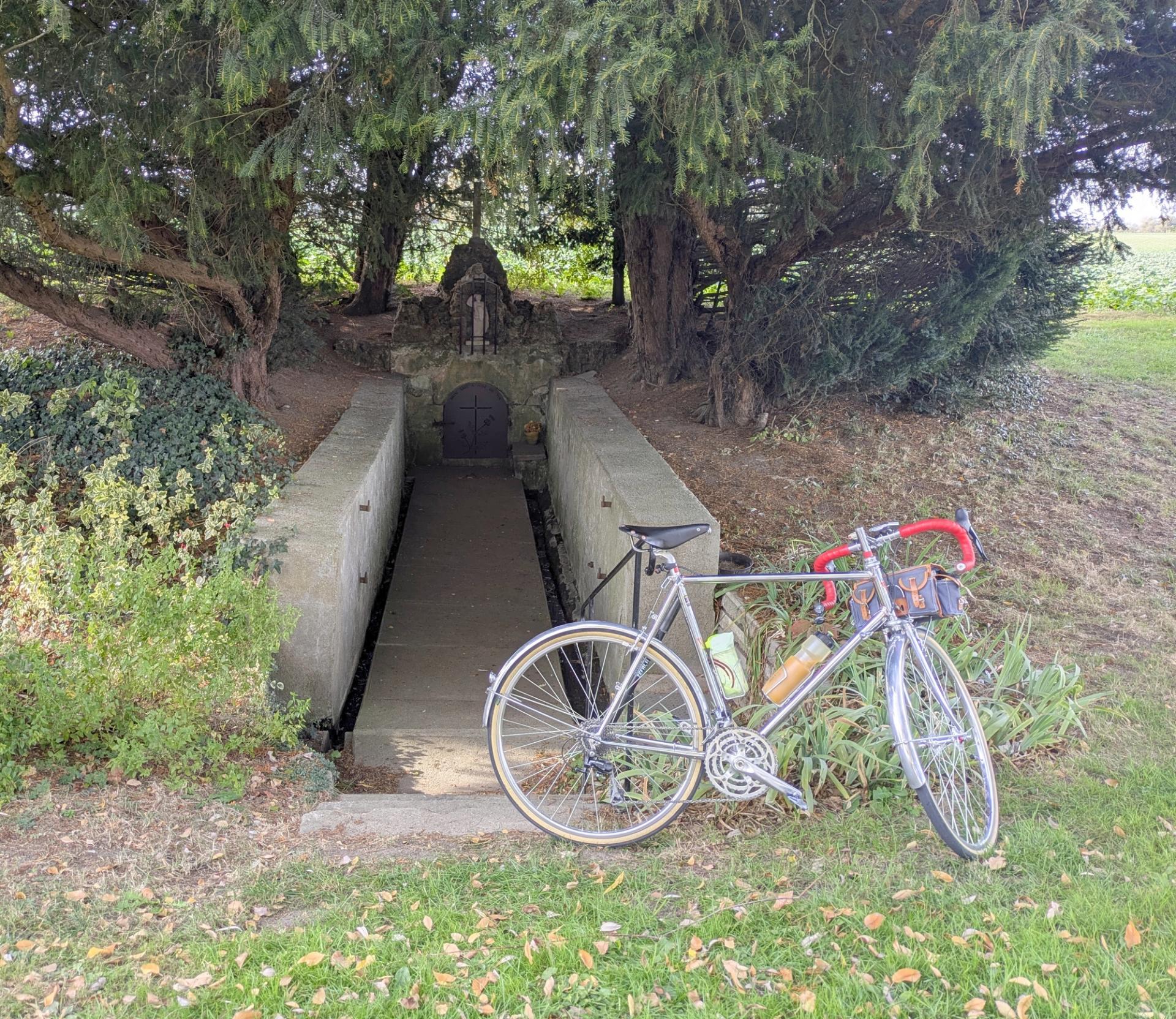Vendredi 24 octobre 2025 : parcours écourté à cause de la pluie très froide. Cyclo trempé et frigorifié. Sortie à oublier !Parmi les messages que j'ai reçus récemment il y en a un qui m'a beaucoup fait plaisir. Il m'a été envoyé par un cyclotouriste stéphanois, voici la copie d'écran :Samedi 18 octobre 2025 : je profite de la belle journée prévue pour faire le Rayon Cyclotouriste Angevin vers Bouillé-Loretz. Départ vers 10h00, il fait seulement 8°C mais dans l'après-midi la température atteindra 17°C. Suivant le conseil de l'excellent organisateur de cette randonnée permanente je fais un écart et je vais à Luigné découvrir la source de Saint Avertin. Ce saint serait donc venu à Luigné et y aurait fait jaillir une fontaine miraculeuse : Mercredi 15 octobre 2025 ; nouveau passage à Beaufort en Vallée : photo du château (ce qu'il en reste !) : Lundi 13 octobre 2025 : beau soleil devant l'église de Beaufort en Vallée :