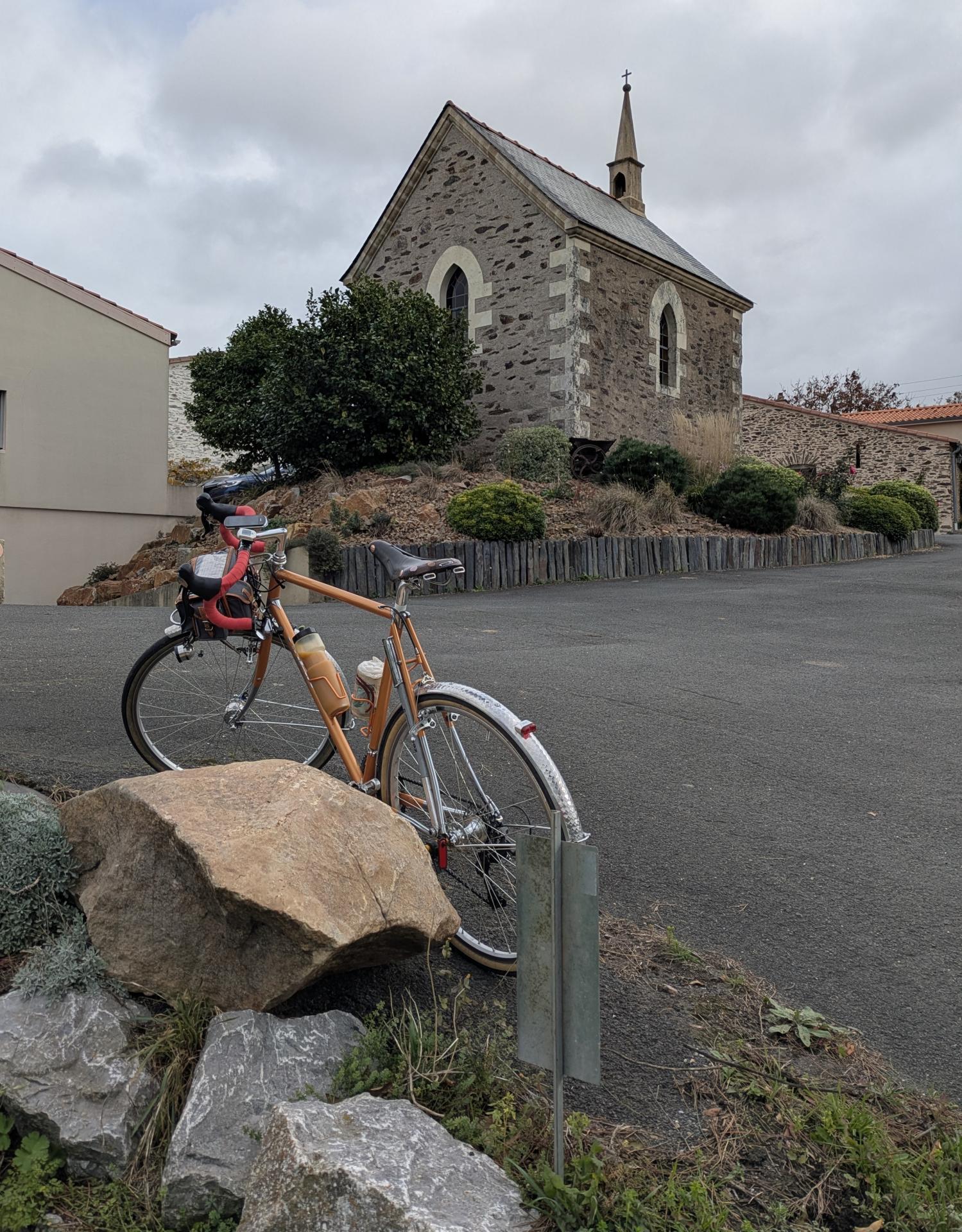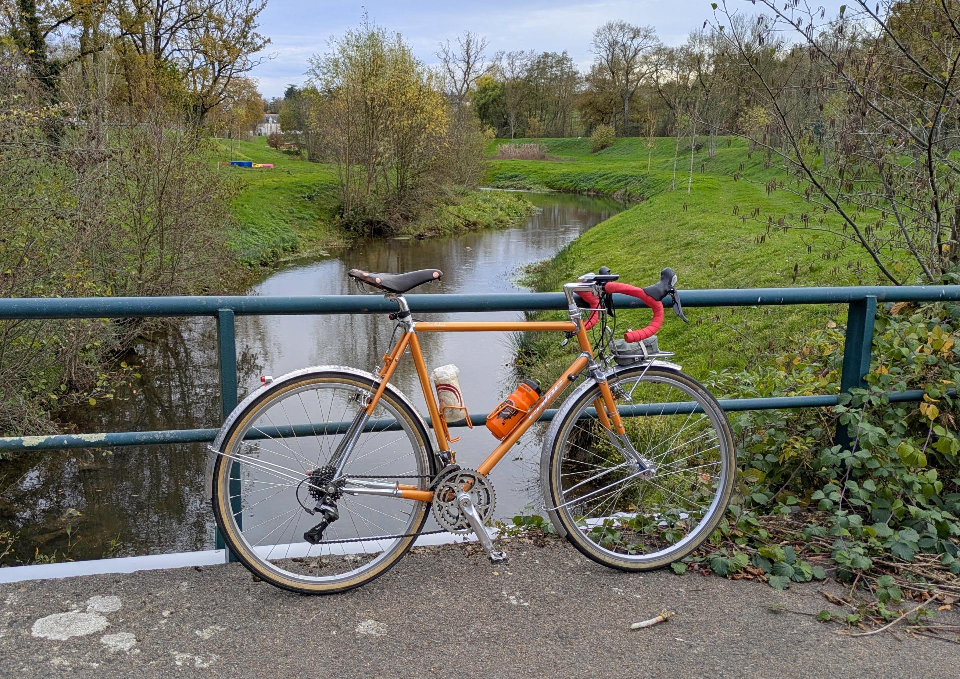 Tout évolue ! Pour plaire à un plus grand nombre de cyclistes allergiques à l'effort physique les VAE deviennent particulièrement esthétiques. Puisque la " mode " nous arrive souvent de nos amis américains voici le beau vélo qu'ils viennent de nous proposer. Chacun sera admiratif devant son élégance. La finesse de ses tubes rappelle évidemment la délicatesse des formes du Gitane de Jacques Anquetil ou de celui de Bernard Hinault, le guidon plat est d'une discrétion qui va plaire aux amateurs d'aérodynamisme, l'intégration du moteur est tellement bien réussie qu'on le devine à peine, les pneus larges respectent les derniers résultats des recherches de rendement (peut-être un peu loin quand même des 30 mm. que Pogacar utilise pour gagner le tour de France, vous me répondrez que tout le monde n'a pas les jambes de Tadej ni celles d'Urska ! ) (PS : en toute franchise je ne trouve pas ce vélomoteur très coruscant, et vous ?) : Mardi 28 octobre 2025 : superbe randonnée de découvertes : d'abord l'île Dorelle, commune du Cellier (Loire-Atlantique) mais accessible uniquement par un pont en bois près de La Varenne (Maine et Loire). Sur la droite de la photo les poteaux verticaux représentent les différentes hauteurs atteintes par les crues de la Loire depuis 1904, la plus haute étant de 6,42 mètres (cyclos s'abstenir !) :ensuite : visite du village de pêcheurs à La Patache (Champtoceaux) (j'ai, avec eux, un point commun : je suis souvent pêcheur ... par gourmandise) :